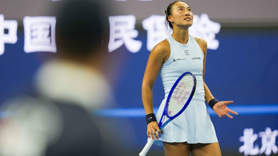 新华社照片,北京,2025年9月29日\n 9月29日,郑钦文在比赛中。\n 当日,在北京举行的2025中国网球公开赛女单第三轮比赛中,中国选手郑钦文对阵捷克选手诺斯科娃。比赛进行至第三盘时,郑钦文因伤退赛,诺斯科娃晋级下一轮。\n 新华社记者 那宇奇 摄