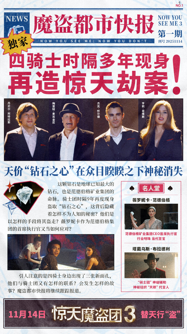 除此之外,贾斯蒂斯・史密斯、多米尼克・塞萨、阿丽亚娜・格林布拉特加盟;“天眼代言人”摩根・弗里曼再度坐镇,裴淳华(《消失的爱人》)惊喜加盟饰演反派“钻石女王”。